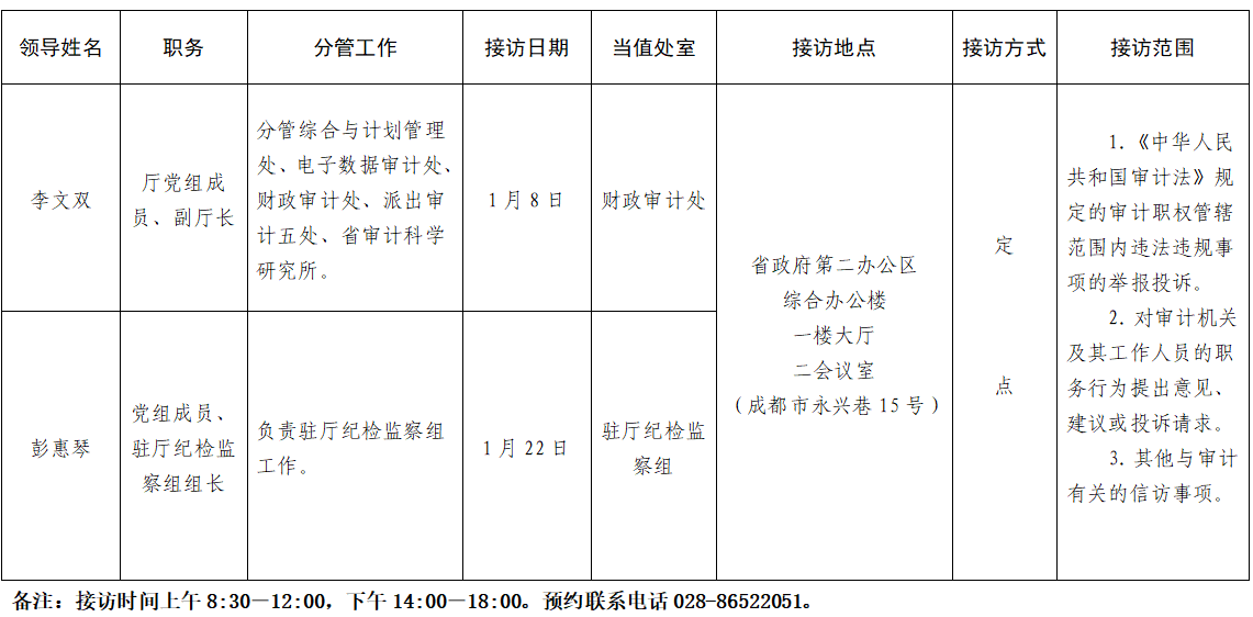 四川省审计厅2026年1月领导干部接访时间表
